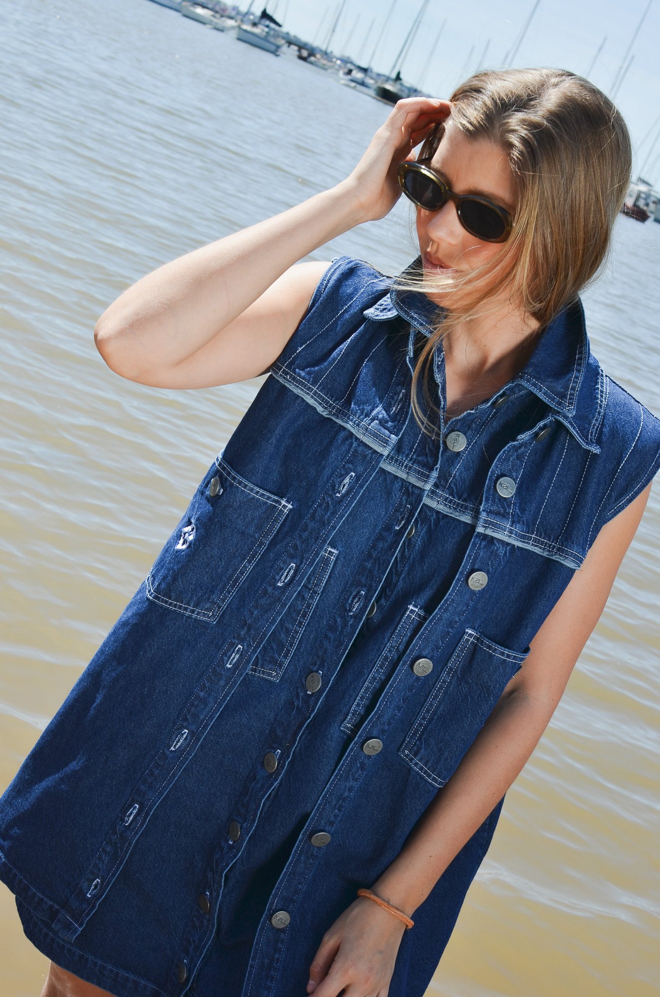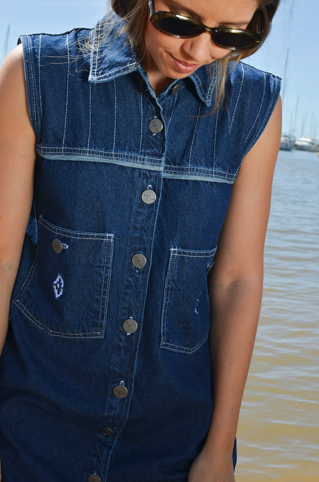Vestido de jean o chaleco? La prenda más linda y versátil del verano, para día o noche. Detalle de pespuntes y bordados que le dan el touch. Diseñado y confeccionado en Uruguay <3 Composición:100% algodón. Cómo se lava?